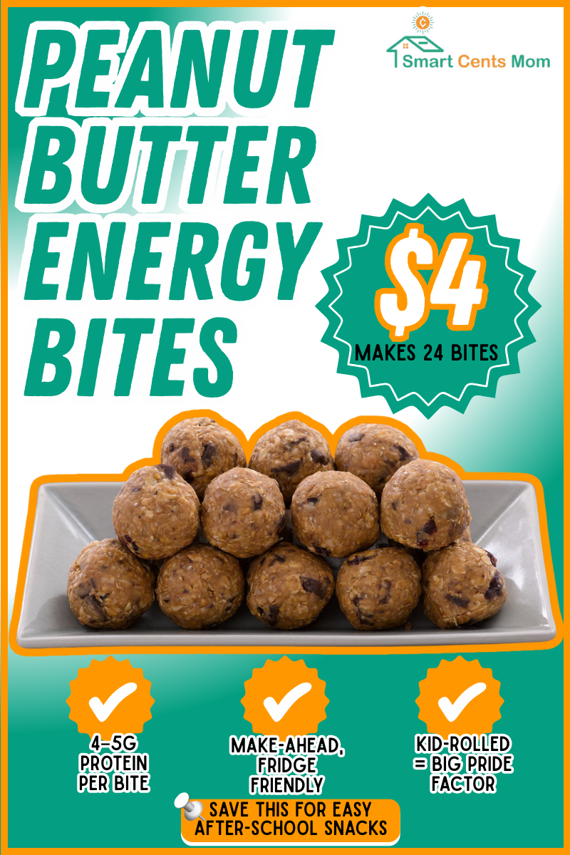 Both boys request these every Sunday for the week ahead. Mix 1 cup oats, ½ cup peanut butter, ⅓ cup honey, ½ cup mini chocolate chips, and ¼ cup ground flaxseed. Roll into balls and refrigerate. The whole batch costs about $4 for 24 bites, which works out to roughly 17 cents each. They pack 4-5 grams of protein per bite. Prep time runs 15 minutes, and they last all week in the fridge. My second grader helped roll these for his class snack box and felt so proud. Use any nut or seed butter you have. Sunflower seed butter works great for nut-free schools, and it costs about the same at Walmart.