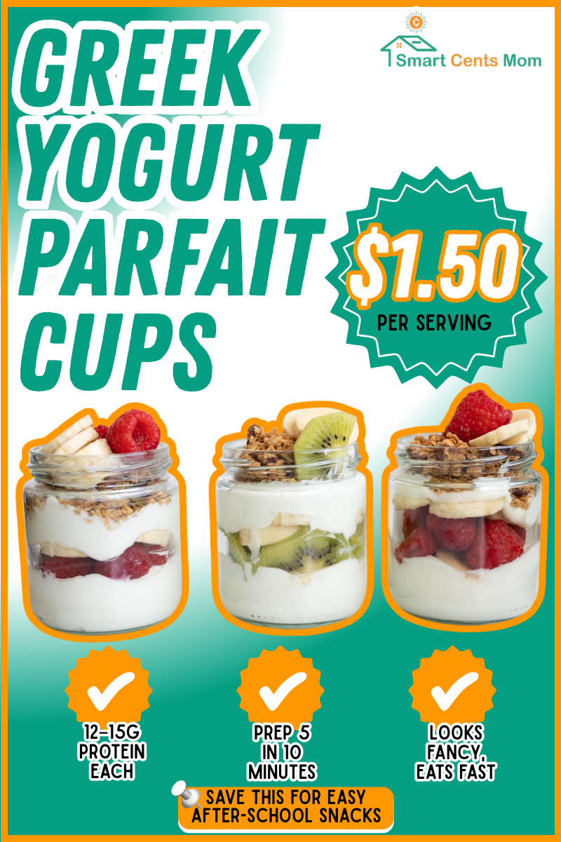 You’ll find options like Peanut Butter Energy Bites that cost about $0.25 each and take 10 minutes to make. There are Greek Yogurt Parfait Cups you can prep Sunday night for grab-and-go mornings, and Turkey and Cheese Roll-Ups that pack 10+ grams of protein with zero cooking required. Whether you need something for the car ride to practice or a filling after-school snack that holds them until dinner, this list has you covered.