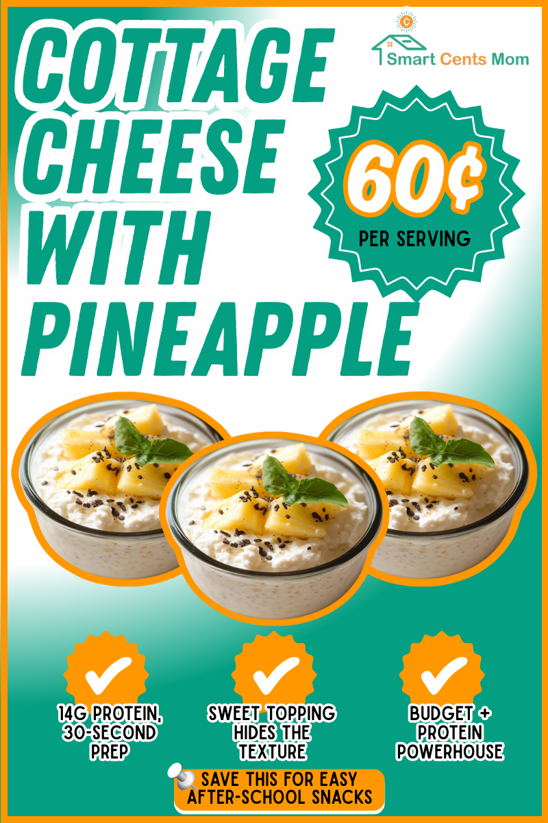 My teacher brain loves how simple this is. Scoop ½ cup cottage cheese into a bowl and top with canned pineapple chunks. Each serving costs about 60 cents with 14 grams of protein, and it takes 30 seconds to assemble. The sweet pineapple makes kids forget they’re eating cottage cheese, which packs way more protein than regular yogurt. My second grader will eat this, but draws the line at plain cottage cheese. Use the pineapple juice to thin the cottage cheese if the texture bothers your kids. Small curd cottage cheese at Target works better than large curd for picky eaters.