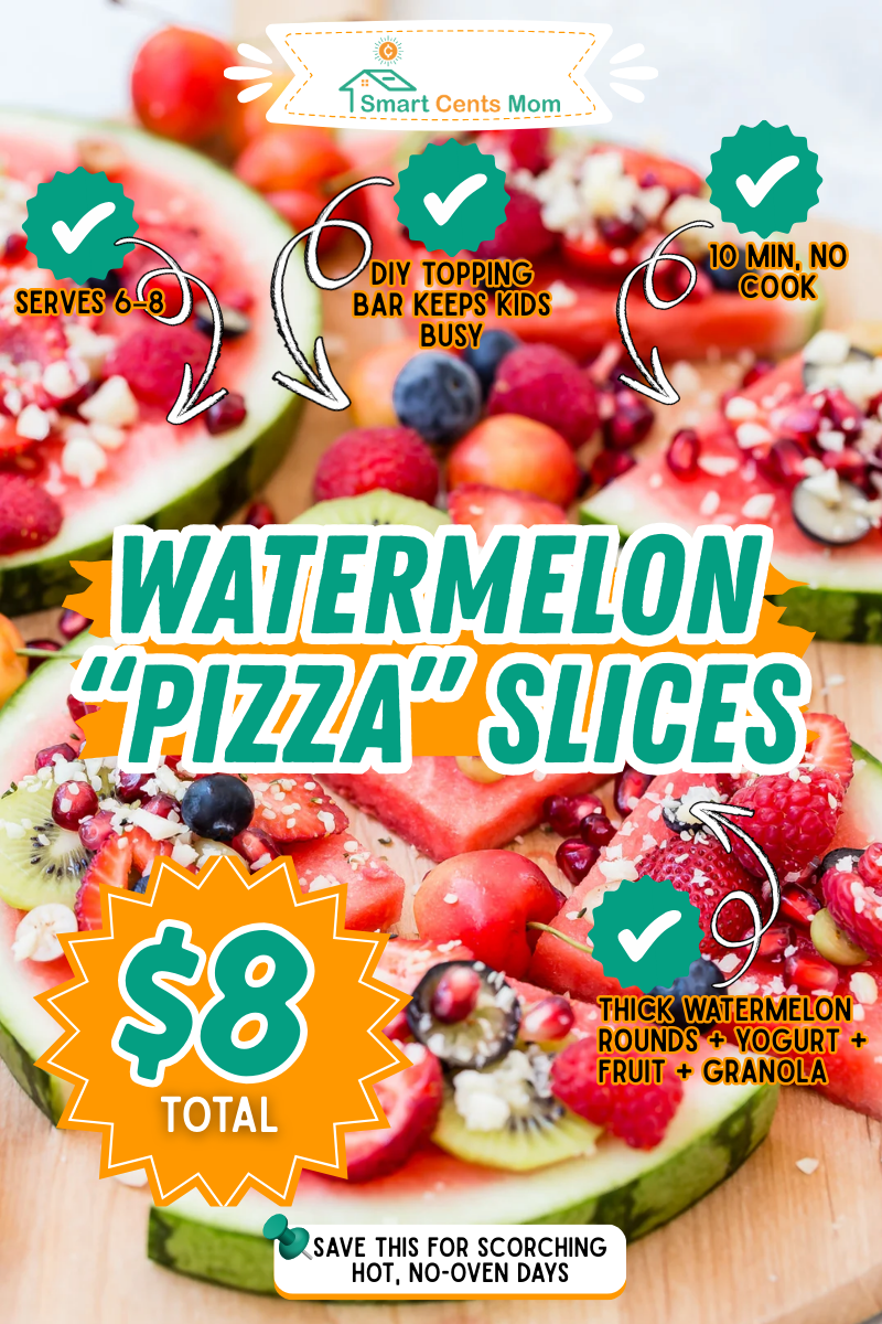 Cut watermelon into thick rounds and let the kids go wild decorating them with Greek yogurt, blueberries, strawberries, and a sprinkle of granola. The whole snack runs about $8 and serves 6-8 kids, making it perfect for when your boys invite half the neighborhood over. My second grader’s entire swim team devoured these after practice last week. Prep takes 10 minutes, zero cooking required. The cold watermelon is pure relief on those 95-degree Florida afternoons when you’re all melting.