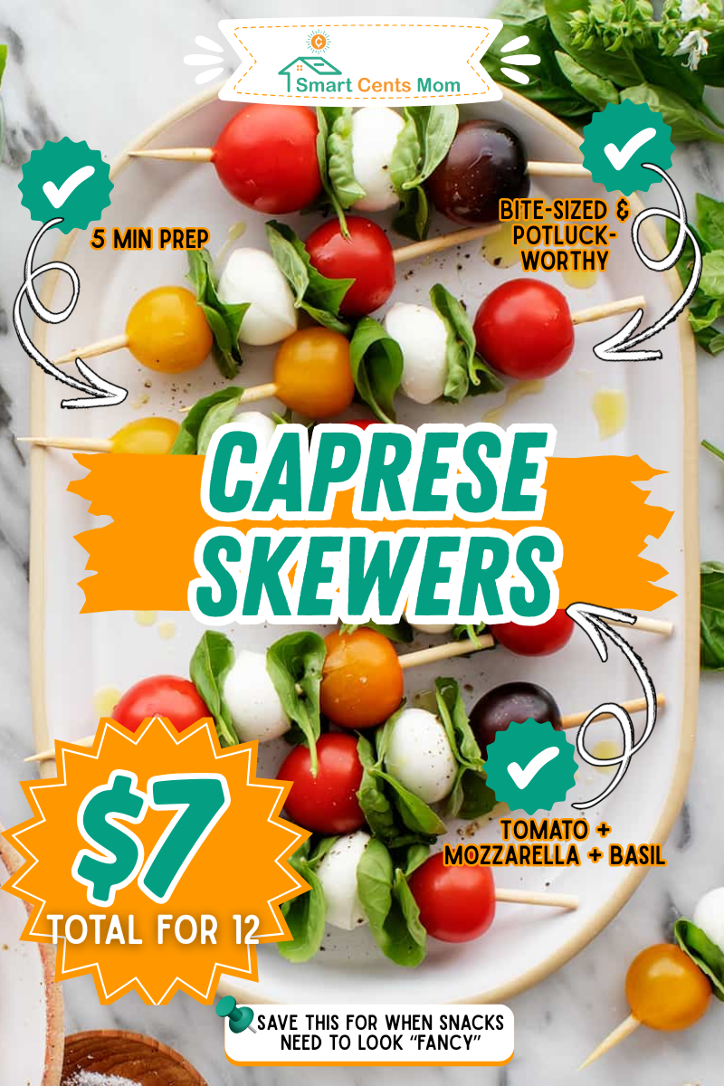 Thread cherry tomatoes, mini mozzarella balls, and basil leaves onto toothpicks or short skewers. Takes 5 minutes, costs about $7 for 12 skewers, and feels fancy enough that kids think it’s special. My oldest made these for a Cub Scout potluck and came home asking when we could make them again. The bite-sized format makes them less intimidating than a full salad.
