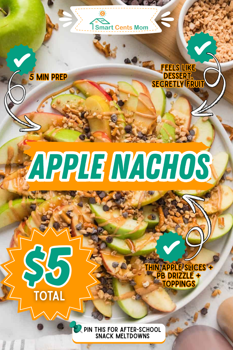 Slice 3-4 apples, arrange them on a plate, and drizzle with peanut butter thinned out with a tiny bit of water. Sprinkle with mini chocolate chips, granola, or coconut flakes. This saved us during Little League season when we needed something quick between school and practice. The whole plate costs under $5 and takes 5 minutes. Kids love the nacho concept, and you’re getting fruit into them.