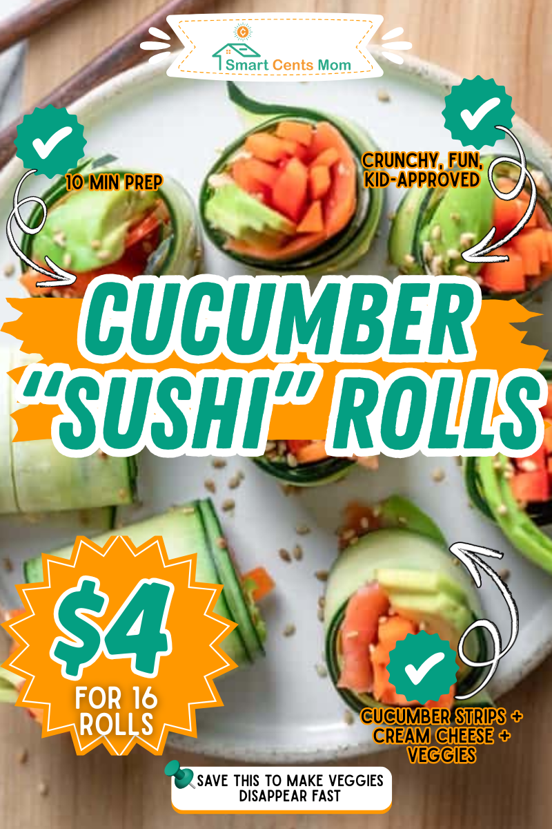 Slice cucumbers lengthwise into thin strips, spread with cream cheese, add a line of shredded carrot or bell pepper, and roll them up. My teacher brain loves how this makes vegetables feel like an activity. At $4 for about 16 rolls, they’re cheaper than actual sushi and way more kid-friendly. Prep time is 10 minutes once you get the hang of slicing. The crunch is satisfying, and the cream cheese makes everything taste better.
